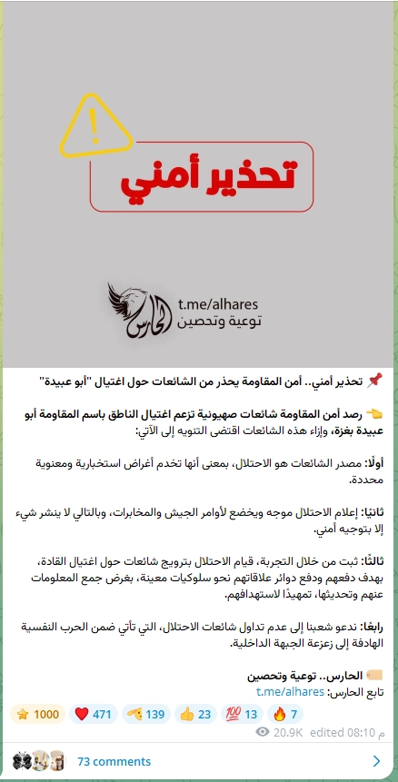 بمراجعة القنوات الرسمية لـ//ـ..حـ...ــ//ـركة حـ...ـ،،ـمـ،'"ـاس، لم يصدر أي إعلان حتى اللحظة حول اسـ....ـ...ـ...ـتشـ..\\\.ـهاد زوجة الناطق الرسمي أبو عـ....ـبيـ.....ـ...دة في المقابل نشرت قناة "الحارس"التابعة للمقـ...ــاومـ....ـة على منصة تلغرام تحذيرا أمنيا واعتبرت ما يتم تداوله مجرد شائعات يجب الحذر منها.