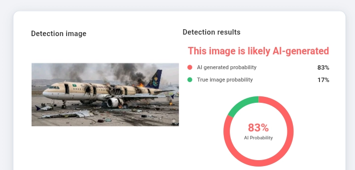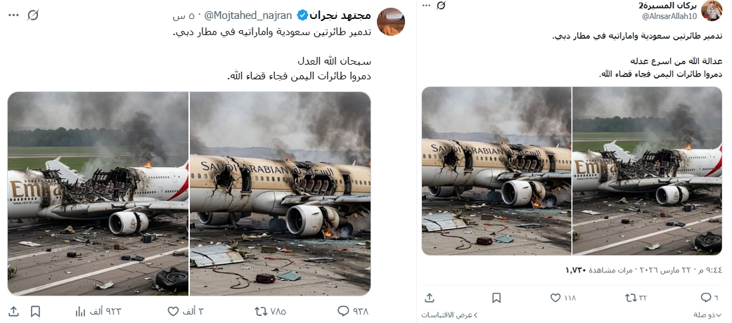 الصورة لطائرة مدنية مدمّرة مولَّدة بالذكاء الاصطناعي، وليست للسعودية أو الإمارات.