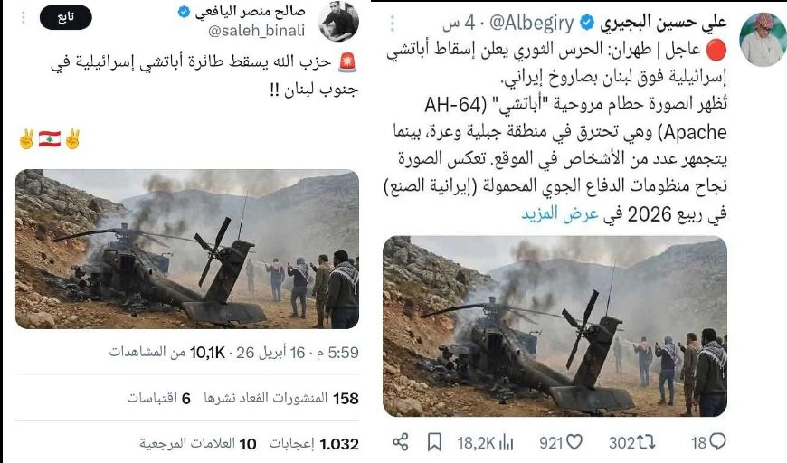 تداولت حسابات على مواقع التواصل الاجتماعي صورة لطائرة مروحية سقطت على الأرض، ويدّعي المتداولون المنقسمون إلى طرفين أن الطرف الأول يقول إنها طائرة إسرائيلية أسقطتها أسلحة الحرس الثوري الإيراني جنوب لبنان فيما يقول الطرف الآخر إنها طائرة إسرائيلية أسقطها حزب الله جنوب لبنان بينما الحقيقة مختلفة