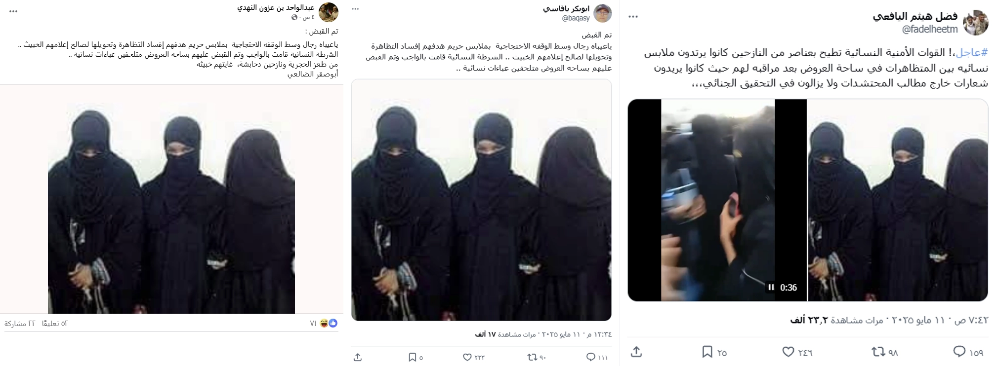 تداولت حسابات على مواقع التواصل الاجتماعي صورة تدّعي أنها لثلاثة رجالٍ متنكرين بملابس نسائية، قبضت عليهم السلطات الأمنية في عدن وسط التظاهرة النسائية التي قادتها النساء للمطالبة بالخدمات الأساسية. ما حقيقة الصورة المتداولة؟