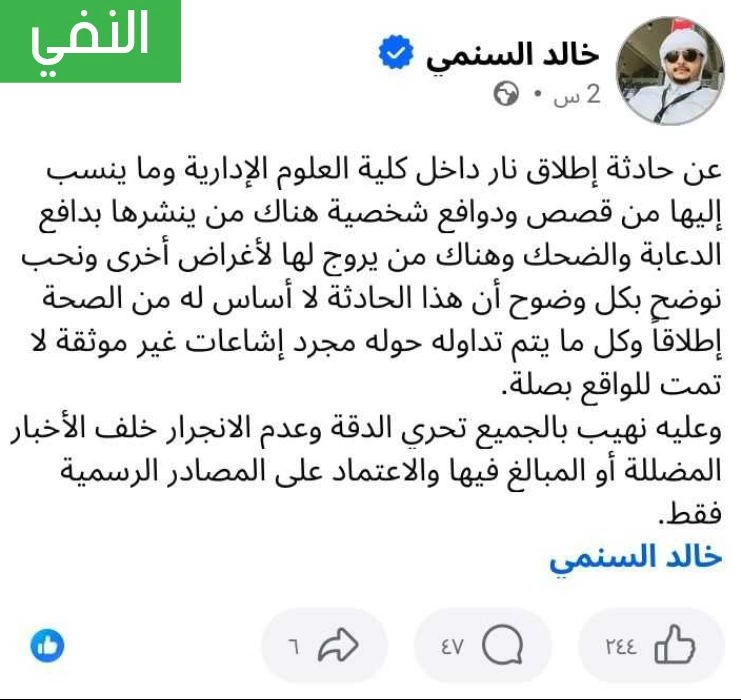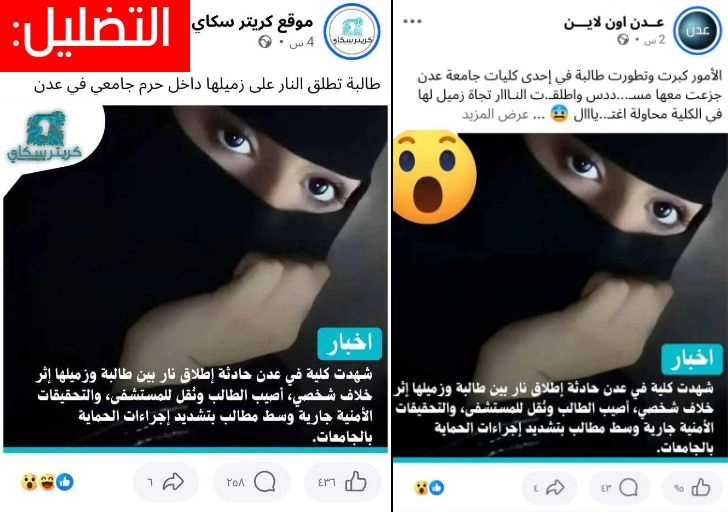 تداولت حسابات على مواقع التواصل الاجتماعي خبرًا يزعم أن طالبة أطلقت النار على زميلها داخل كلية العلوم الإدارية في جامعة عدن، فما حقيقة الخبر المتداول؟
