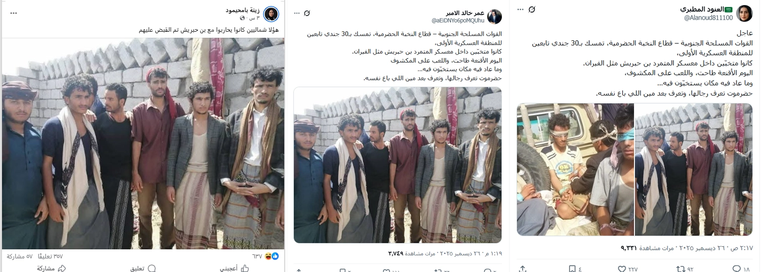 تداولت حسابات على مواقع التواصل الاجتماعي صورة زُعم أن النخبة الحضرمية تمسك بثلاثين جنديًا تابعين للمنطقة العسكرية الأولى...فما حقيقة الصورة المتداولة؟
