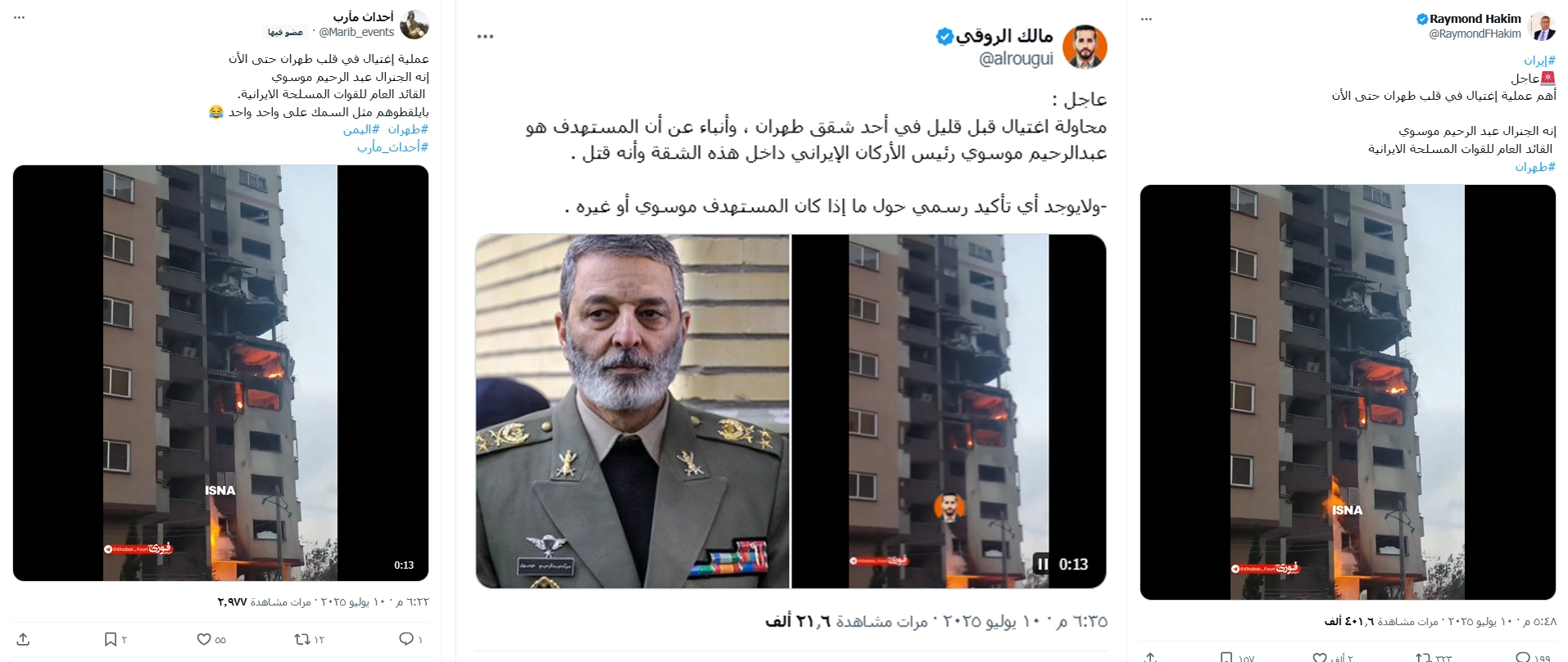 تحقّق فريق منصة مُسند من الفيديو المتداول باستخدام أدوات البحث العكسي، وتبيّن أنه قديم ويعود إلى تاريخ 13 يونيو 2025، خلال المواجهات التي دارت بين إيران وإسرائيل. ويظهر في الفيديو مجمع "سارف" السكني في منطقة سعادة آباد شمالي طهران، وقد نشرته حينها وكالة " ISNA" الفارسية . وخلال عملية التحقق، لم يعثر فريق منصة مُسند على أي مصدر رسمي من الجانبين يؤكد ادعاء اغتيال القائد العام للقوات المسلحة الإيرانية، اللواء عبد الرحيم موسوي.