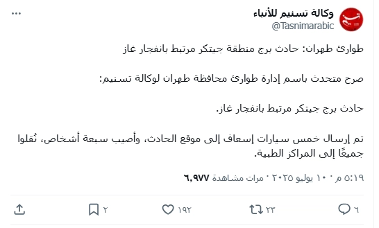 تزامن تداول الفيديو مع إعلان وكالة "تسنيم" الإيرانية عن وقوع حادث انفجار ناتج عن تسرّب غاز في برج سكني بمنطقة "جيتكر" في العاصمة طهران.