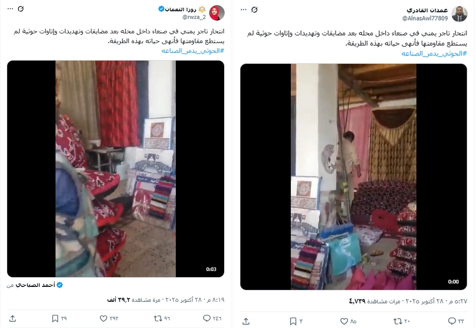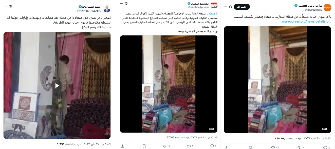 تداولت حسابات على منصات التواصل الاجتماعي مقطع فيديو قيل إنه يُظهر انتحار تاجر يمني في صنعاء داخل محله، بسبب تعرّضه لمضايقات وتهديدات متكرّرة وفرض إتاوات من قِبل جماعة الحوثي، ما دفعه إلى إنهاء حياته. فما حقيقة الفيديو المتداول؟ وهل هو حديث أم قديم؟