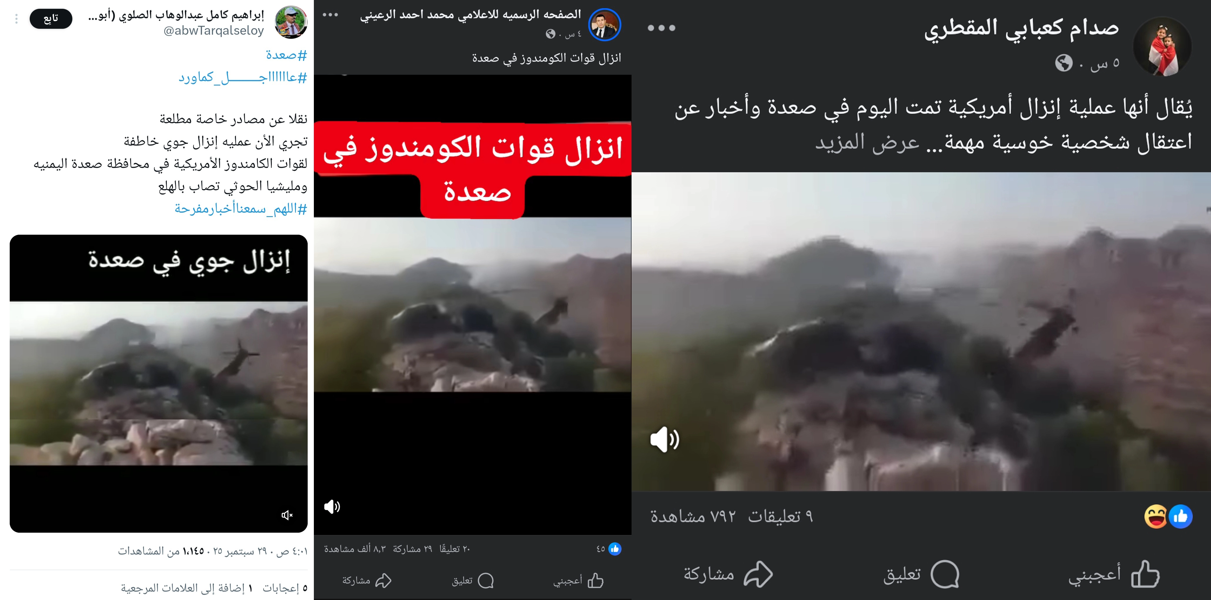 يأتي انتشار الفيديو بعد تداول مزاعم عن عملية إنزال جوي في صعدة نفذها الكومندوز الأميركي، دون وجود أي معلومات رسمية أو موثوقة تؤكد وقوع عملية إنزال حتى اللحظة.