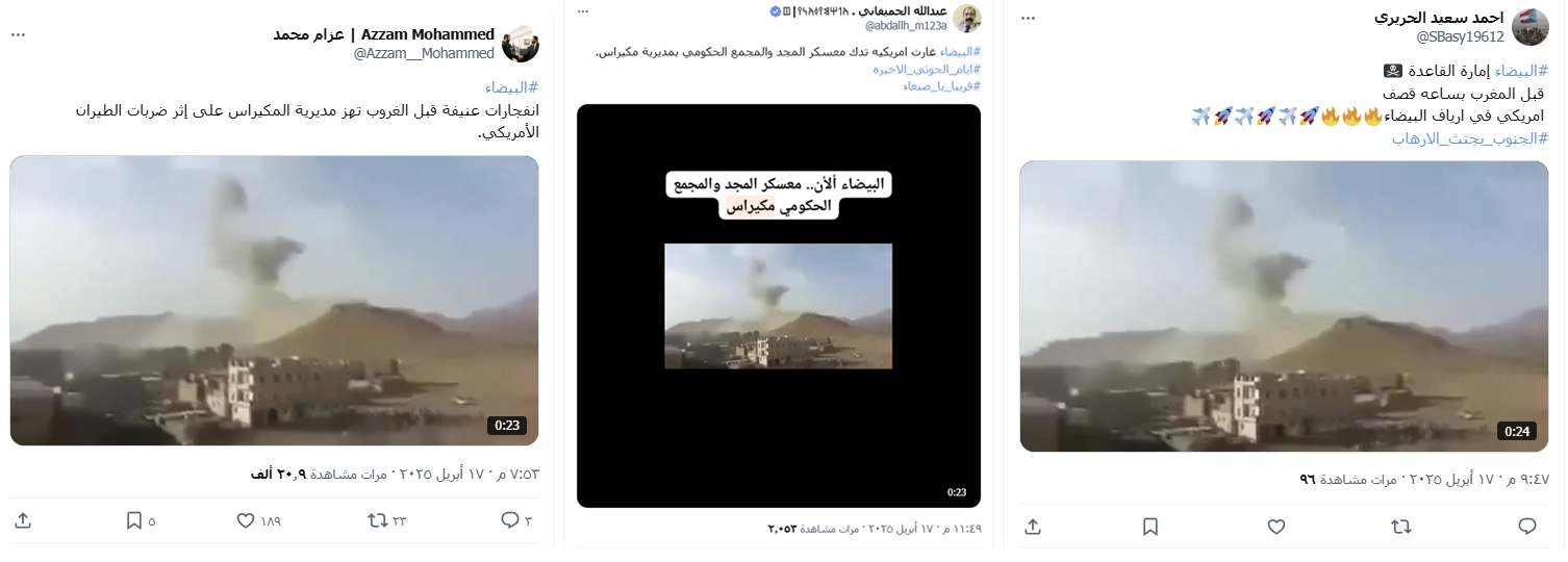 تداولت حسابات يمنية على منصات التواصل الاجتماعي فيديو تدعي انه يوثق قصف امريكي أستهدف أمس "معسكر المجد"بمحافظة البيضاء ضمن استهدافها مواقع تخضع لسيطرة جماعة الحوثي . فما حقيقة الفيديو المتداول؟