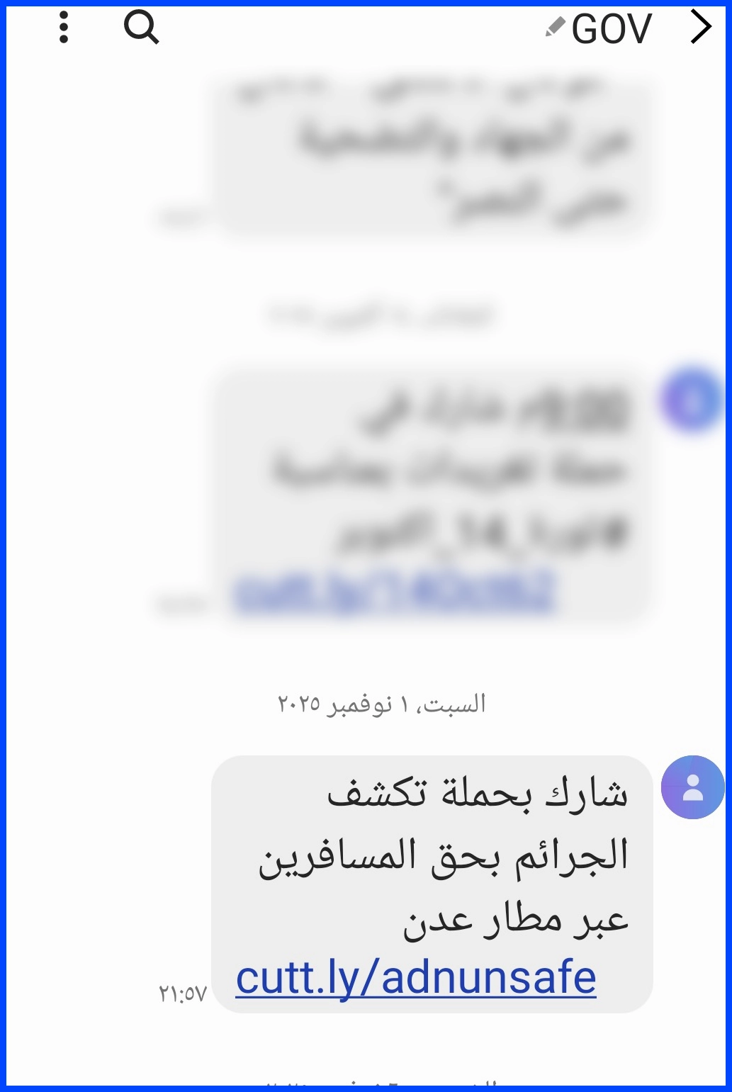 وبحسب ما وثّقته منصة "مسند"، فقد تلقّى مواطنون في مناطق سيطرة الحكومة رسائل صادرة من شبكات "يمن موبايل" في يوم السبت 1 نوفمبر 2025، تتضمن دعوات للمشاركة في حملة ضد مطار عدن تحت عنوان: "شارك بحملة تكشف الجرائم بحق المسافرين عبر مطار عدن"، مرفقة برابط يقود إلى بنك تغريدات حوثي يحتوي منشورات مضللة تستهدف المطار.