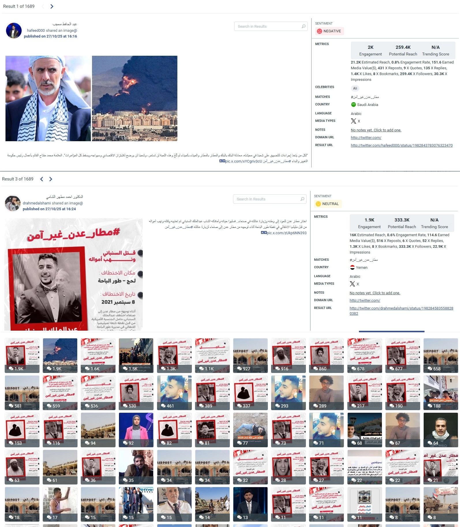 خلال ساعات من ظهور وسم مطار_عدن_غير_آمن تصاعدت منشورات اعتمدت على قوالب موحدة وروابط مكررة، في مشهد لا يعكس مخاوف سفر فردية بقدر ما يظهر تشغيلًا رقميًا موجهاً.