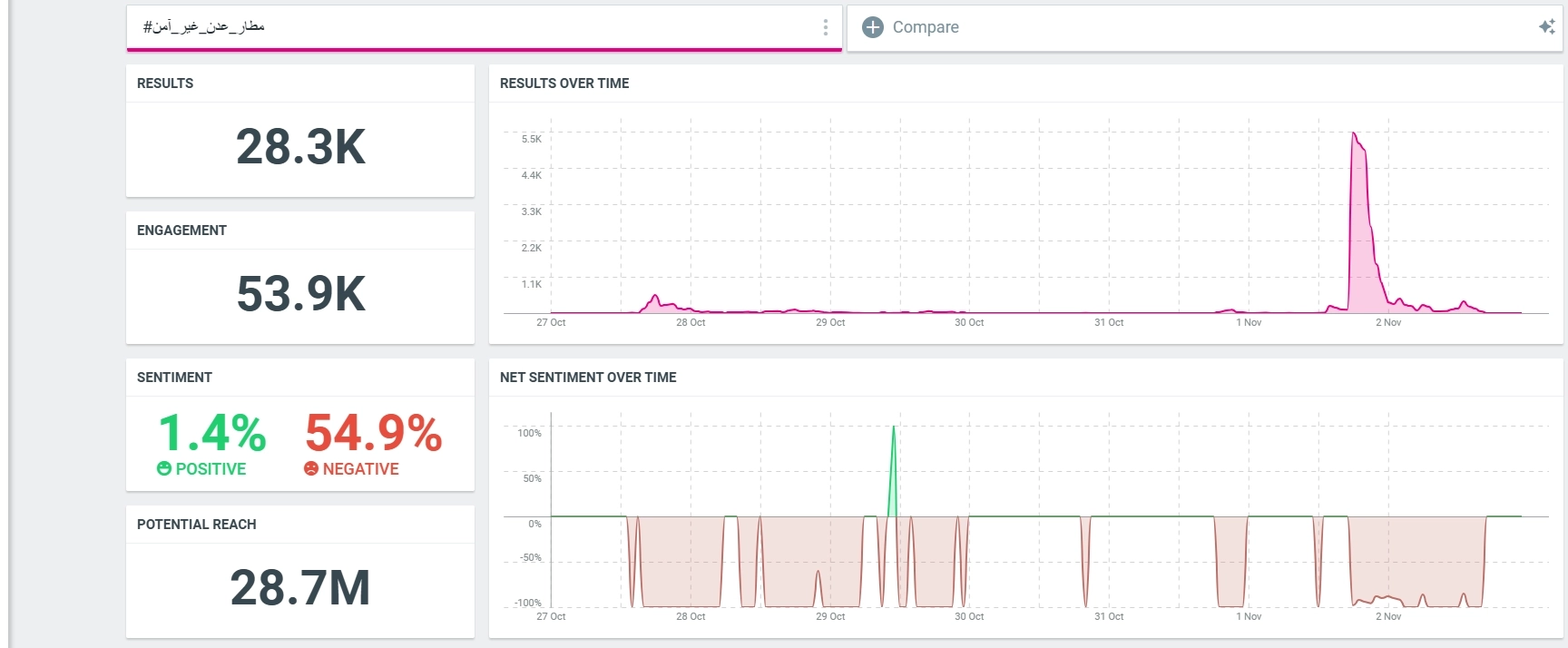 وأظهرت بيانات الرصد أن هذين الوسمين حققا نشاطًا متفاوتًا؛ إذ سجّل وسم مطار_عدن_ممر_آمن نحو 3.9 آلاف منشور و8.9 ملايين وصول محتمل في حين حقق وسم مطار_عدن_خط_أحمر حوالى 4.5 آلاف منشور و10.5 ملايين وصول. ورغم أن حجم الانتشار كان أقل من الحملة الأصلية إلا أن توقيت الإطلاق وتركيز الرسائل يشير إلى محاولة موازنة الخطاب ومحاصرة الرواية السلبية.
