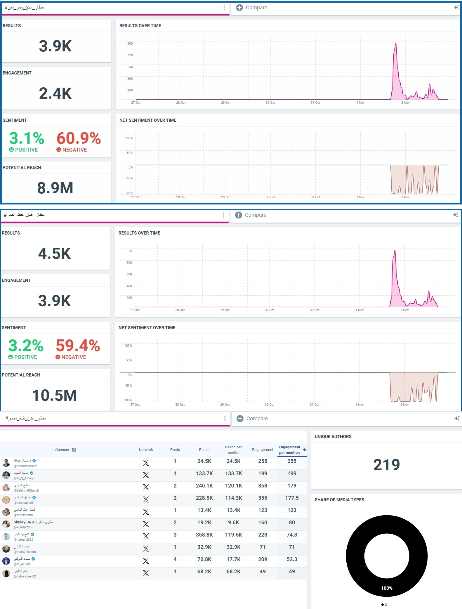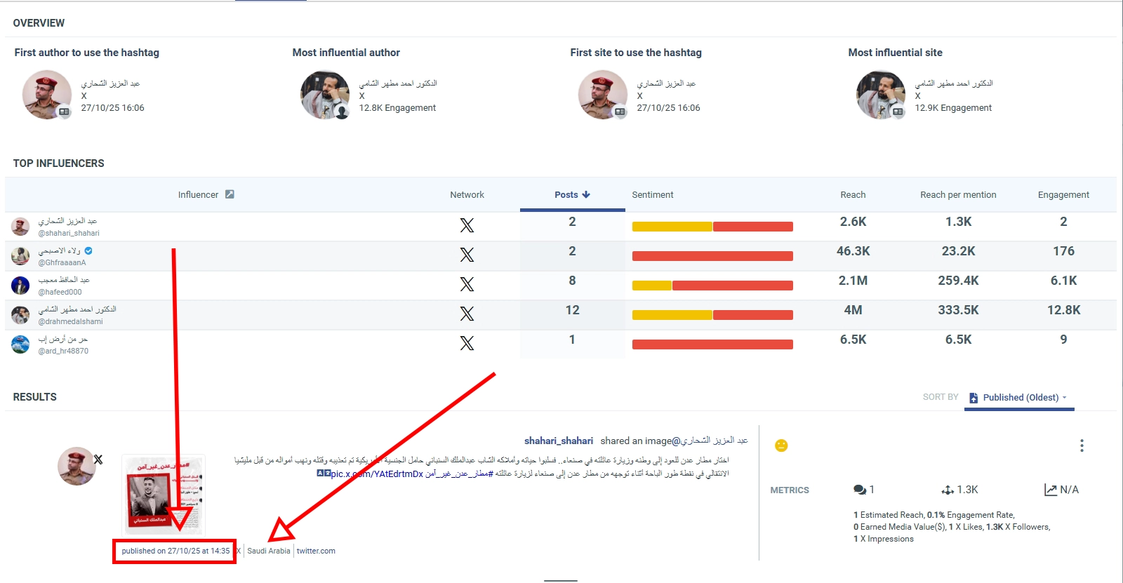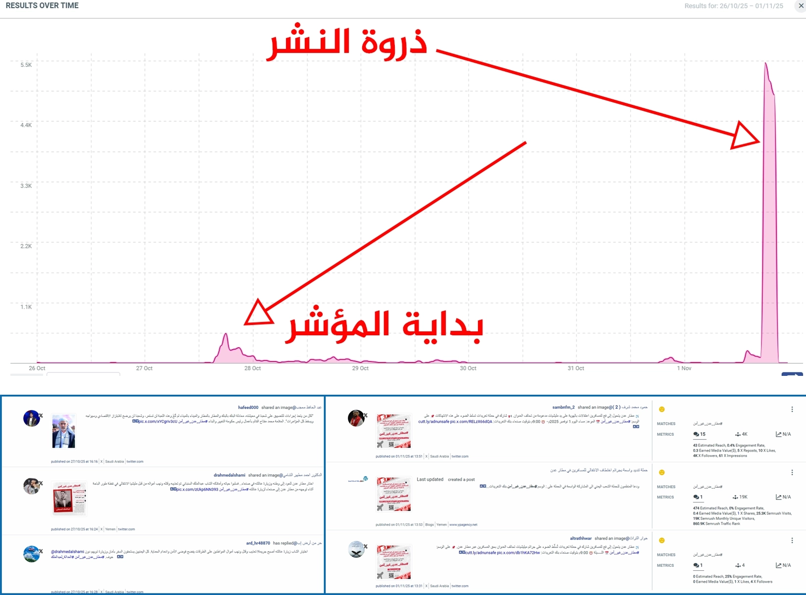 -بلغت الحملة ذروتها في الأول من نوفمبر 2025 عند الساعة 18:00 بعد تعبئة بدأت في 27 أكتوبر وسجّلت نحو 28.4 ألف منشور وأكثر من 54 ألف إعادة نشر بوصول تقديري تجاوز 28.7 مليون مشاهدة عبر نحو 1,400 حساب.