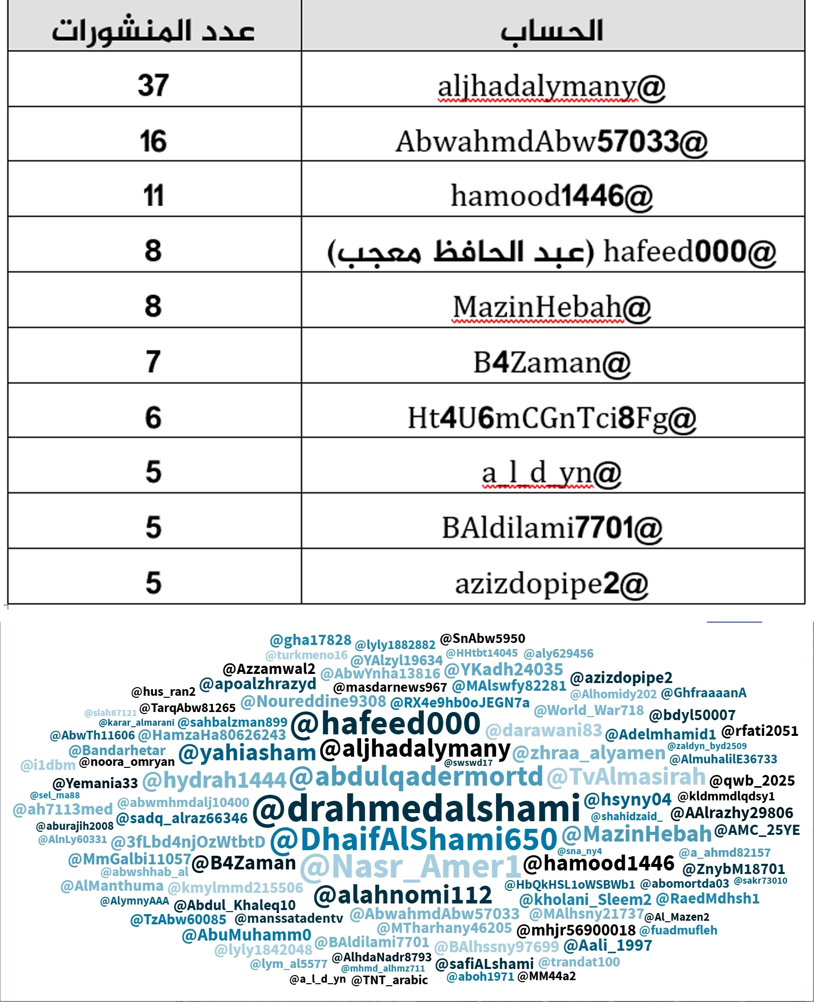 وفي عينة تحليلية تضم 20 ألف منشور، استحوذت أعلى عشرة حسابات على نحو 43% من إجمالي التفاعل داخل العينة؛ وهي نسبة تُظهر تركّزًا غير عضوي يؤشر إلى وجود نواة تشغيل مركزية تقود موجات النشر.