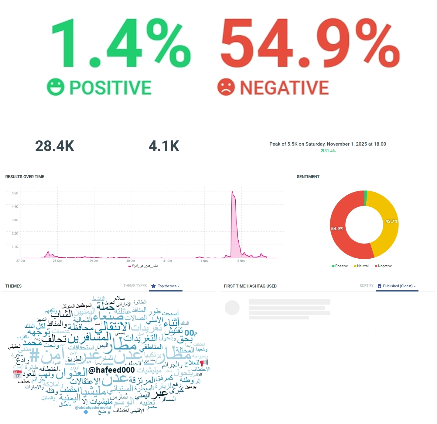 -سيطرت المشاعر السلبية بنسبة 54.9% مع غياب الموضوعية، واعتمد الخطاب على لغة أمنية ومفردات مثل "اختطاف" و"مليشيات" و"تهديد للمسافرين" لتصوير خطر حول مطار عدن، مدعومًا بتضخيم رقمي وهندسة انتشار غير عضوية.