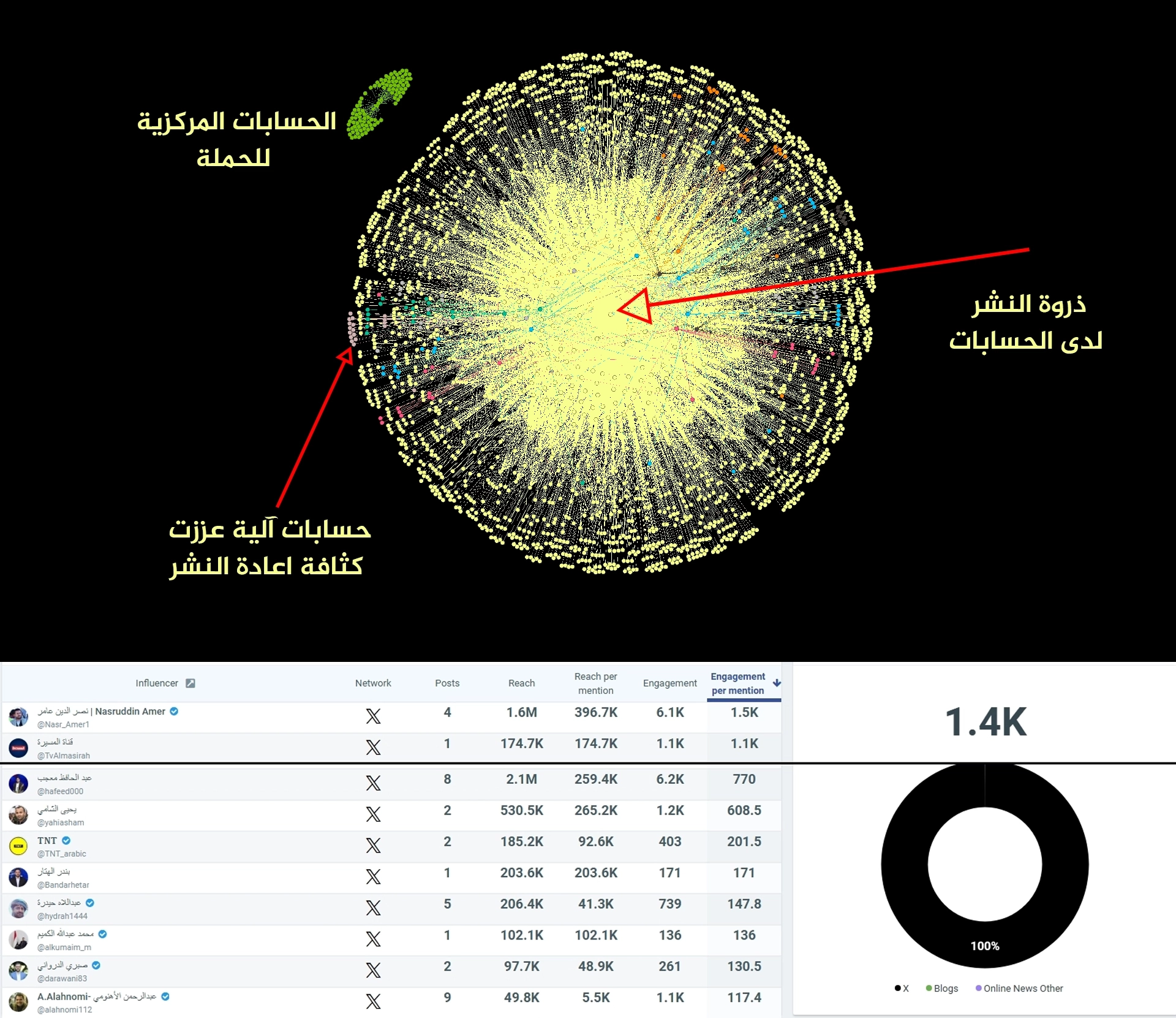 خلال فترة الرصد، وثّقت البيانات نحو 1,400 حساب مشارك في نشاط الحملة بينما شكّلت أقلية منظمة نواة تشغيلية مرتبطة بمضاعفة النشر وبناء الزخم الرقمي.