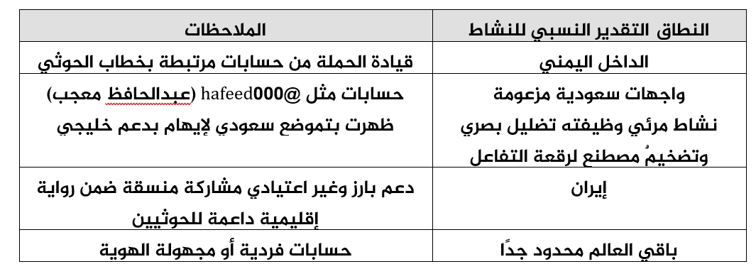 -تركّز النشاط داخل اليمن في مناطق سيطرة الحوثيين، مع استخدام حسابات بواجهة خليجية لإيهام بدعم خارجي، فيما برزت أيضًا بصمات تشغيل وإشارات مبكرة لإدارة مباشرة من طهران.