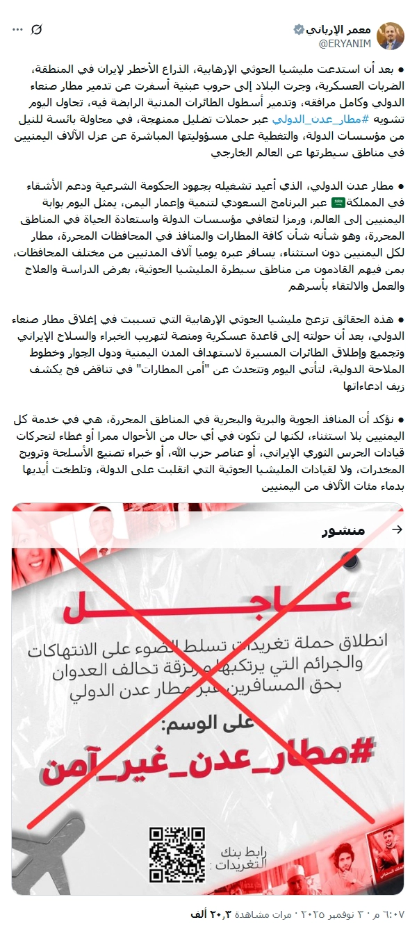 تزامن تداول وسم مطار_عدن_غير_آمن مع تصريحات رسمية نُشرت عبر منصة أكس لـ معمر الإرياني، وزير الإعلام والثقافة والسياحة في الحكومة اليمنية المعترف بها دوليًا، أكد فيه أن مطار عدن الدولي يعمل بشكل طبيعي، ويستقبل مسافرين من مختلف المحافظات بما فيها القادمة من مناطق سيطرة جماعة الحوثي.