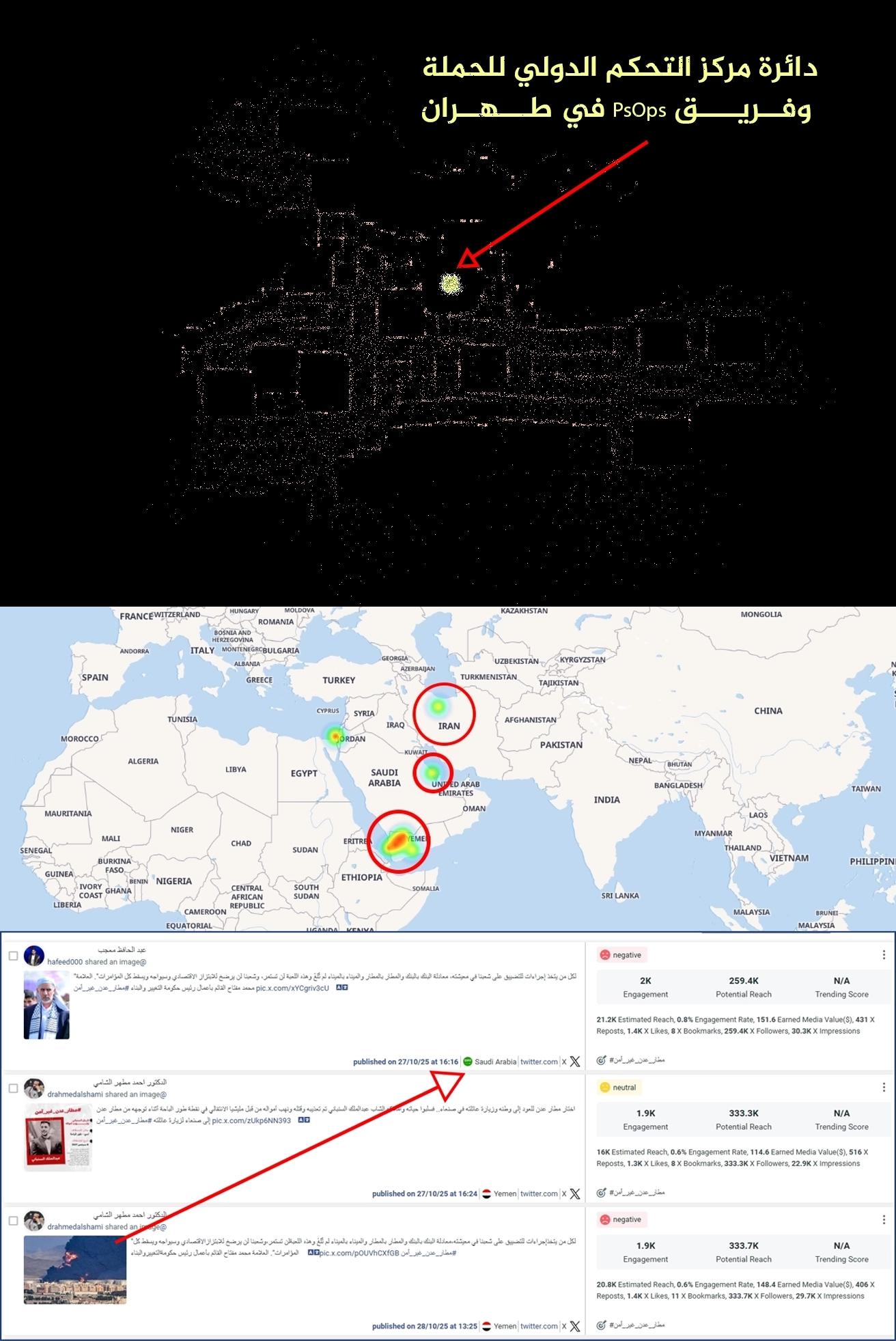 رُصد نحو 28.4 ألف منشور وأكثر من 54 ألف إعادة نشر ووصول محتمل تجاوز 28.7 مليون مشاهدة خلال فترة زمنية قصيرة. ولعبت أساليب التضخيم دورها: استخدمت حسابات تظهر كـ"خليجية" كواجهة تضخيم، بل عمدت بعض الحسابات التابعة لناشطي الجهة إلى تغيير مواقع النشر إلى السعودية لخلق إحساس بـ"تضامن خليجي" مصطنع، بينما تُظهر خريطة الانتشار بصمة نشاط واضحة داخل إيران وتكرارًا متطابقًا في النشر ما يشير إلى إسناد رقمي إقليمي أعاد تدوير السردية ومنحها مدىً أوسع.