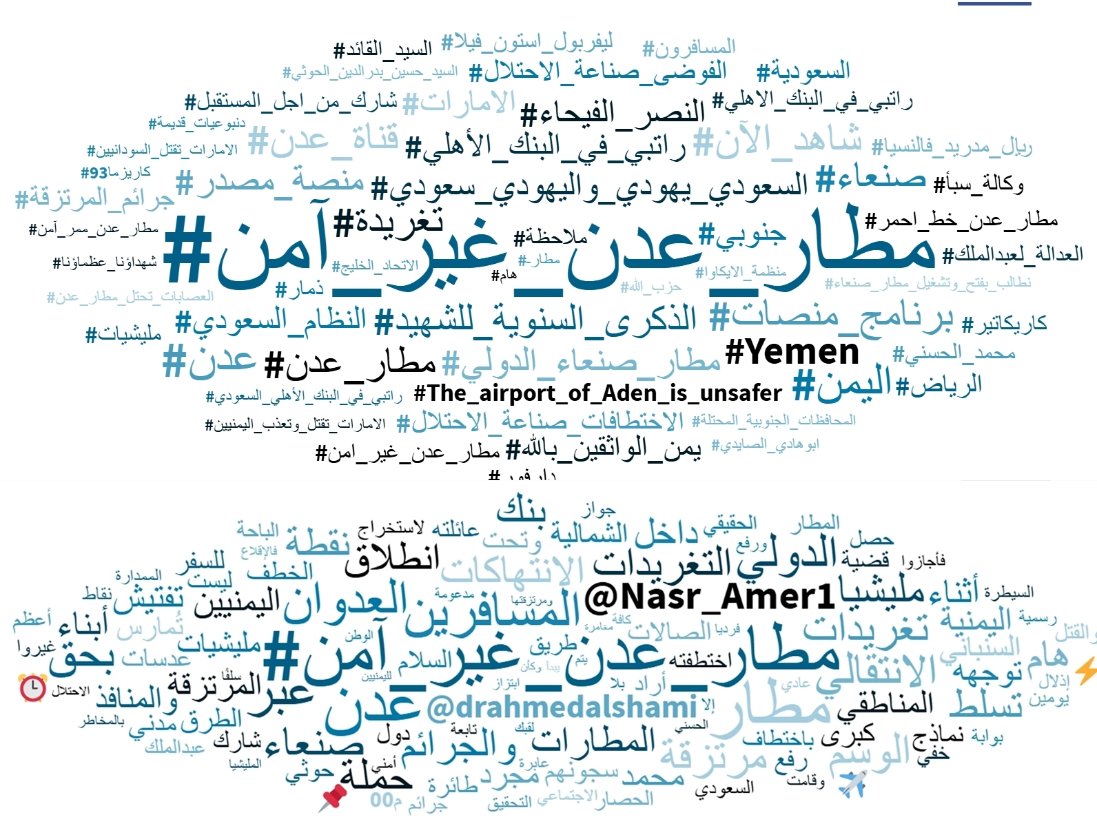 أظهر تحليل سحابة الكلمات المرتبطة بوسم مطار_عدن_غير_آمن أن الحملة صُممت لتعزيز حالة ذعر أمني وتضخيم صورة الفوضى في عدن، عبر تركيز ملحوظ على مفردات ذات دلالات أمنية وسوداوية. فقد تصدرت كلمات مثل ( مطار – عدن - غير آمن – المسافرين – اختطاف – مليشيات – اعتقالات) واجهة النقاش، مشكلةً ما يُقدر بنحو 65% من التكرارات الرئيسية، في مؤشر واضح على هندسة سردية تقوم على ربط المنشآت الحكومية في المدينة بحالة انهيار وفقدان سيطرة.