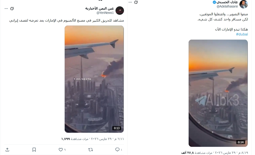 تداولت حسابات على مواقع التواصل الاجتماعي فيديو، قيل إن مسافرًا يصوّر حريقًا ضخمًا في أحد مصانع الألمنيوم في الإمارات بعد الاستهداف الإيراني. فما حقيقة الفيديو المتداول؟