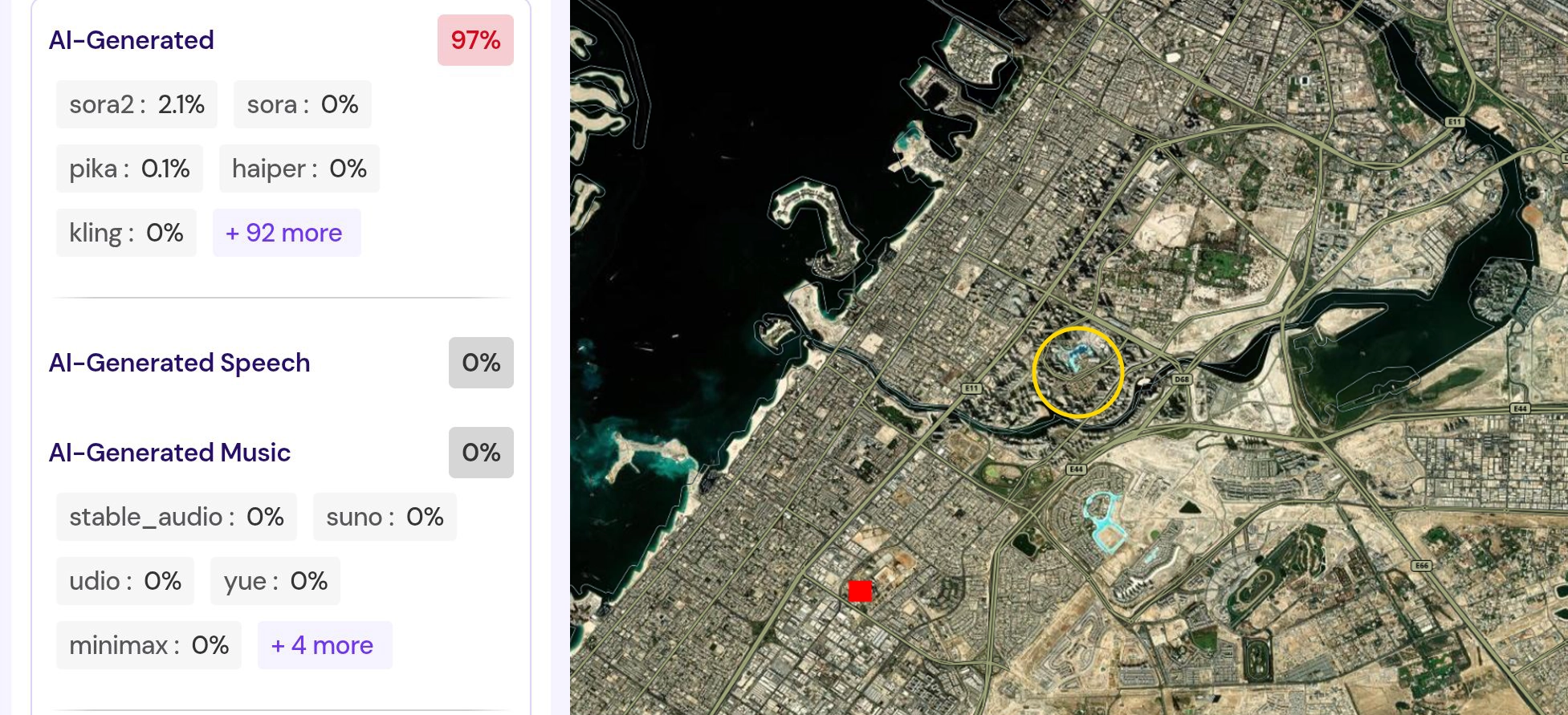 تحقّق فريق منصة مُسند من الفيديو المتداول باستخدام أدوات كشف التزييف العميق، وتبيّن أن الفيديو مُولَّد بالذكاء الاصطناعي ولا يعكس أحداثًا حقيقية في دبي يوم 29 مارس 2026. كما يُظهر موقعًا غير دقيق لبرج خليفة