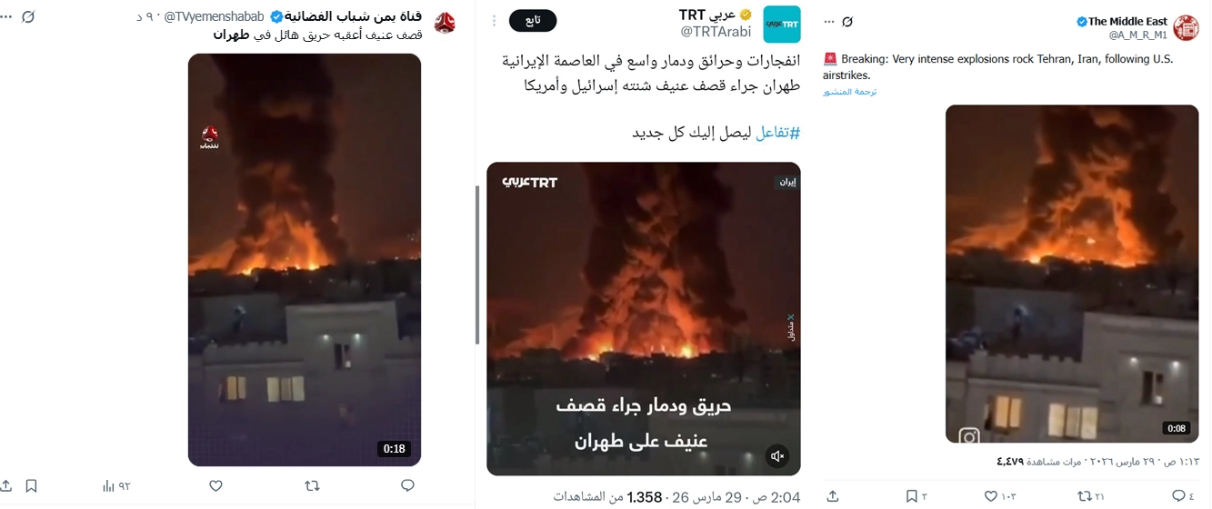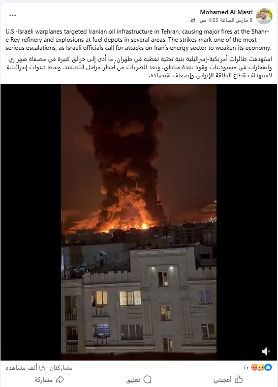 تحقق فريق منصة مُسند من الفيديو باستخدام أدوات البحث العكسي وتبيّن أن الفيديو قديم إذ يعود إلى قصف سابق على مصفاة شهر ري وانفجارات في مستودعات وقود بعدة مناطق بتاريخ 8 مارس 2026، وليس قصفا حديثا اليوم