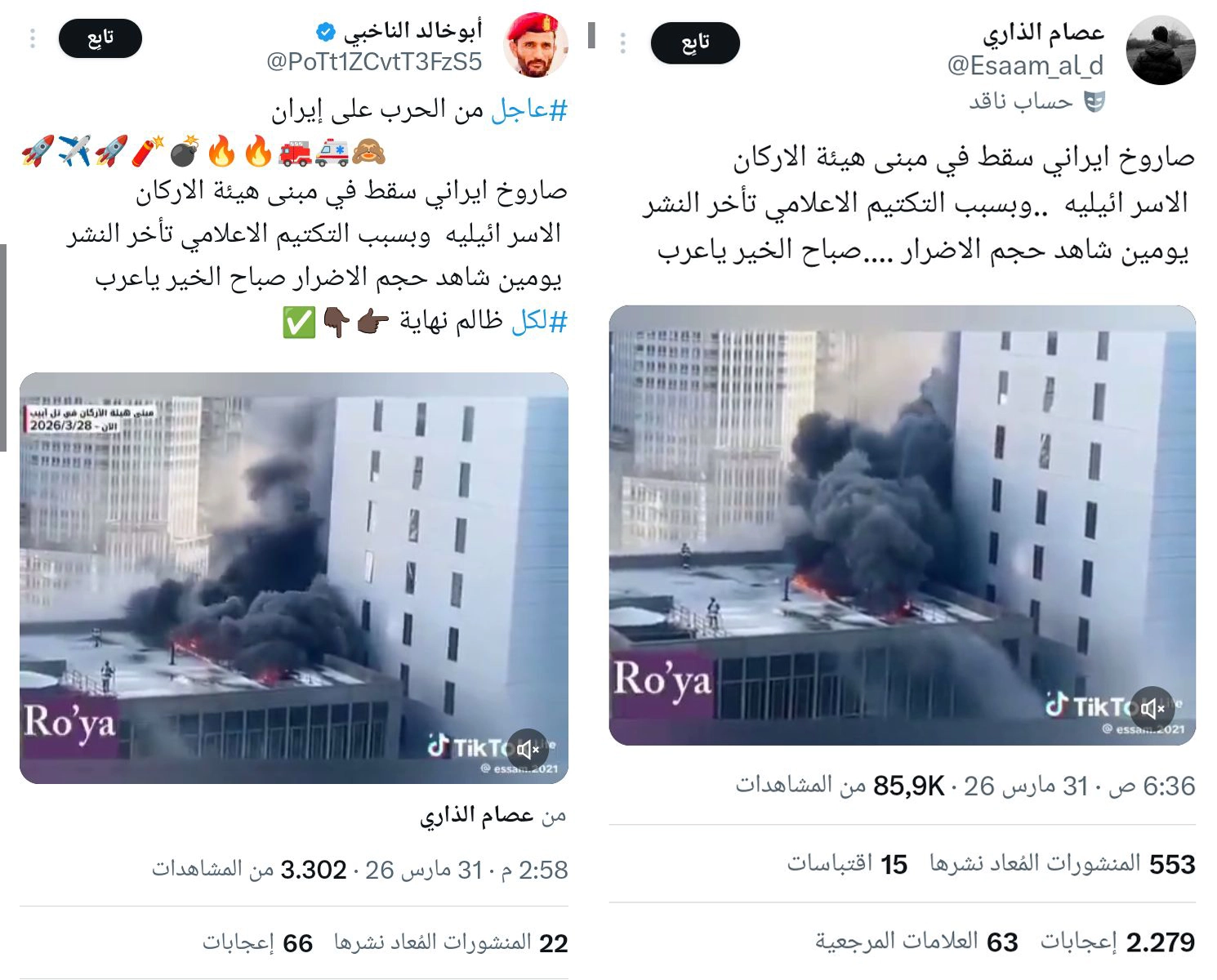 تداولت حسابات على مواقع التواصل الاجتماعي فيديو تدّعي أنه يوثق حرائق اندلعت في مبنى هيئة الأركان الإسرائيلية إثر استهدافه بصاروخ إيراني... ما حقيقة الفيديو المتداول؟