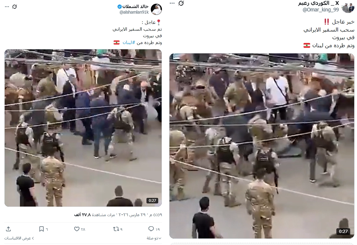 تداولت حسابات على مواقع التواصل الاجتماعي مقطع فيديو يدّعي أنه يوثق طرد السفير الإيراني من لبنان.. فما حقيقة الفيديو المتداول؟