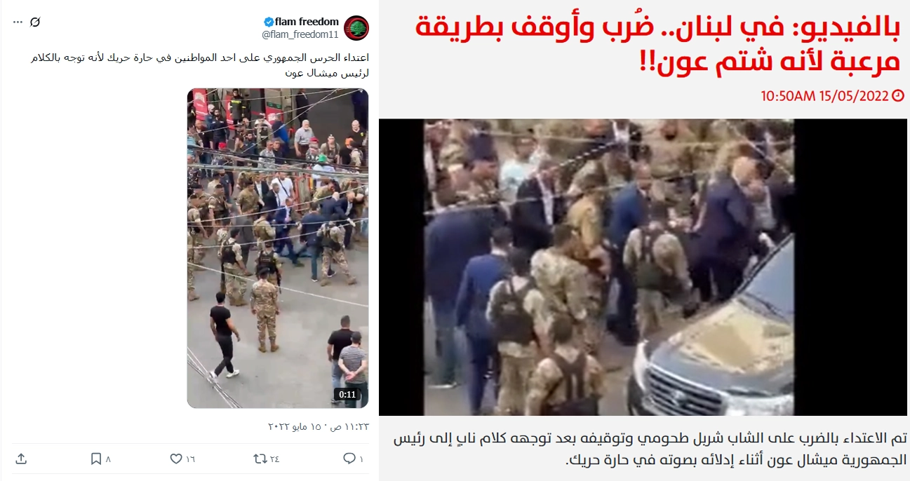 قام فريق منصة مُسند بالتحقق من صحة الفيديو المتداول باستخدام تقنية البحث العكسي، وتبين أن المقطع قديم ويعود إلى حادثة الاعتداء بالضرب على الشاب شربل طحومي وتوقيفه، بعد توجيهه كلامًا نابياً إلى رئيس الجمهورية ميشال عون أثناء إدلائه بصوته في حارة حريك، ونُشر بتاريخ 15 مايو 2022م.