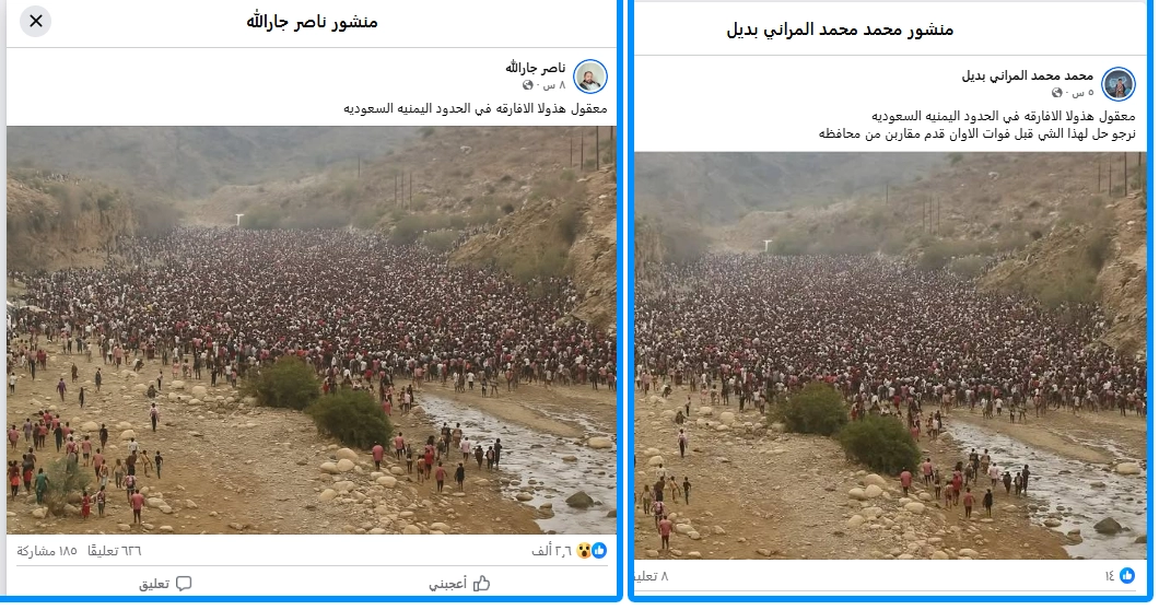انتشرت الصورة على نطاق واسع في منصّات التواصل، مرفقة بتعليقات تزعم أن المهاجرين يتدفّقون نحو الحدود اليمنية-السعودية.